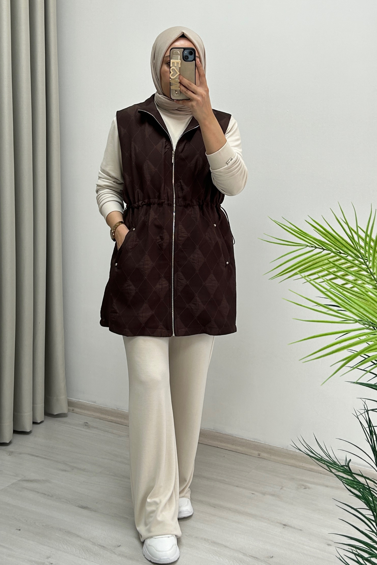 Mevsimlik Full Fermuar Kapamalı Ayarlanabilir Bel Büzme Detaylı Astarlı Kapitone Yelek Kahve