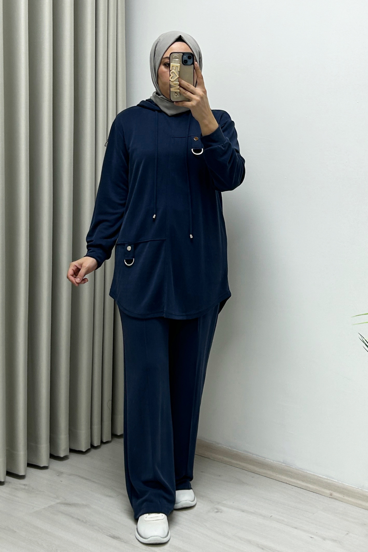 Puane Yeni Sezon Modal Petek Kumaş Kapüşonlu Aksesuar Detaylı Tesettür Kadın İkili Takım Lacivert
