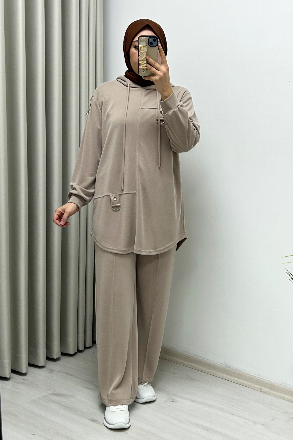 Puane Yeni Sezon Modal Petek Kumaş Kapüşonlu Aksesuar Detaylı Tesettür Kadın İkili Takım