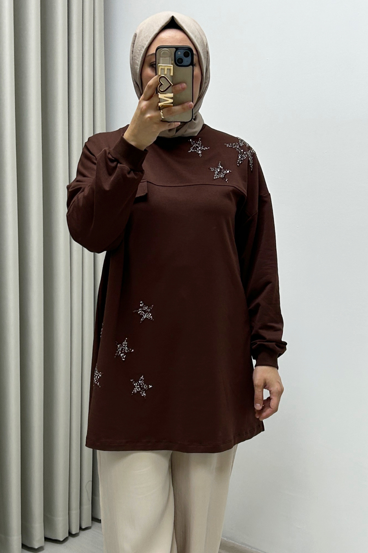 Puane Yeni Sezon Yıldız Detaylı Tesettür Kadın Tunik Kahve