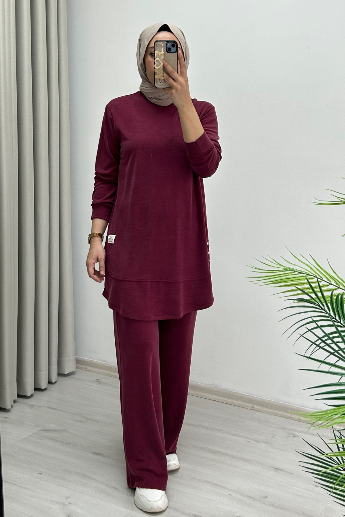 Tripen Petek Kumaş Bisiklet Yaka Yan Düğme Detaylı Kadın Tesettür İkili Takım Bordo