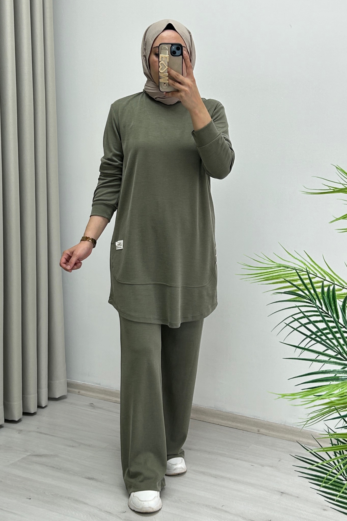 Tripen Petek Kumaş Bisiklet Yaka Yan Düğme Detaylı Kadın Tesettür İkili Takım Haki