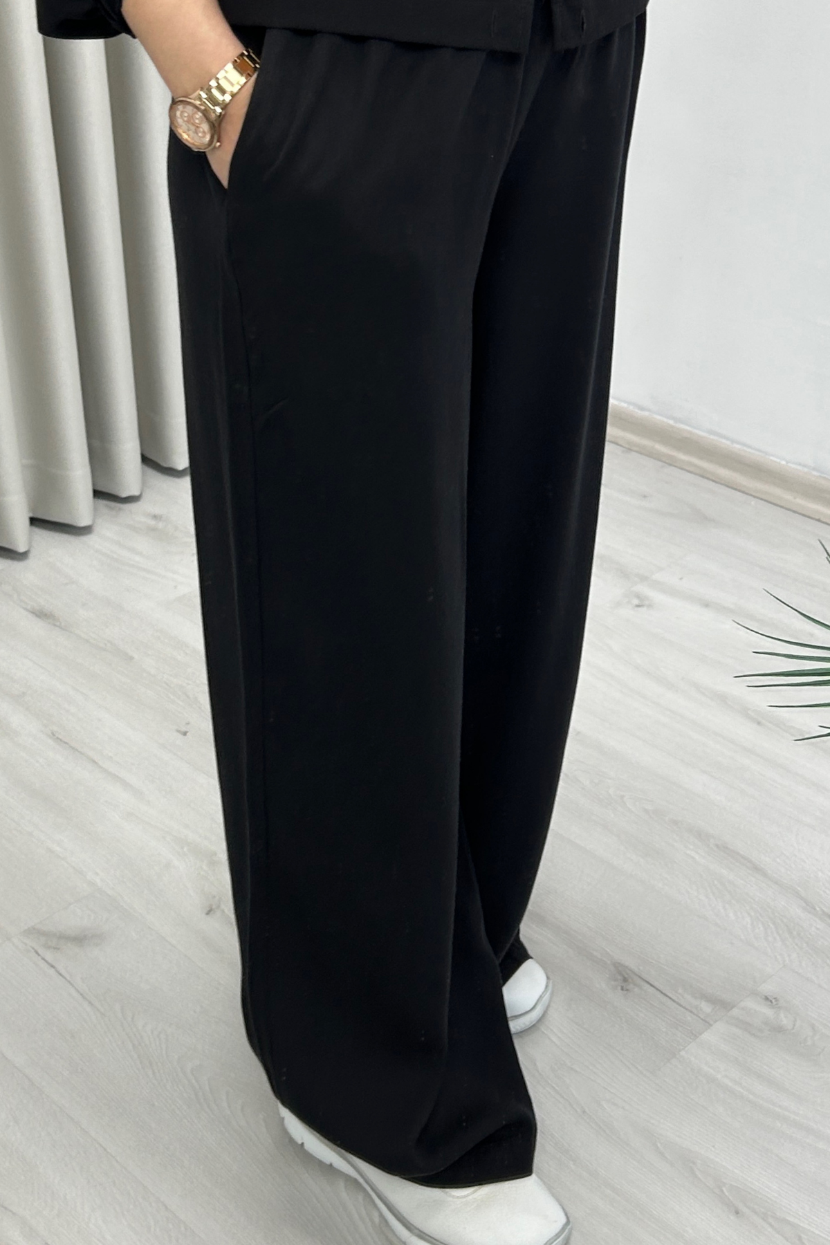 Yeni Sezon Premium Kumaş Yumuşak Dokulu Dökümlü Bol Paça Kadın Pantolon Siyah