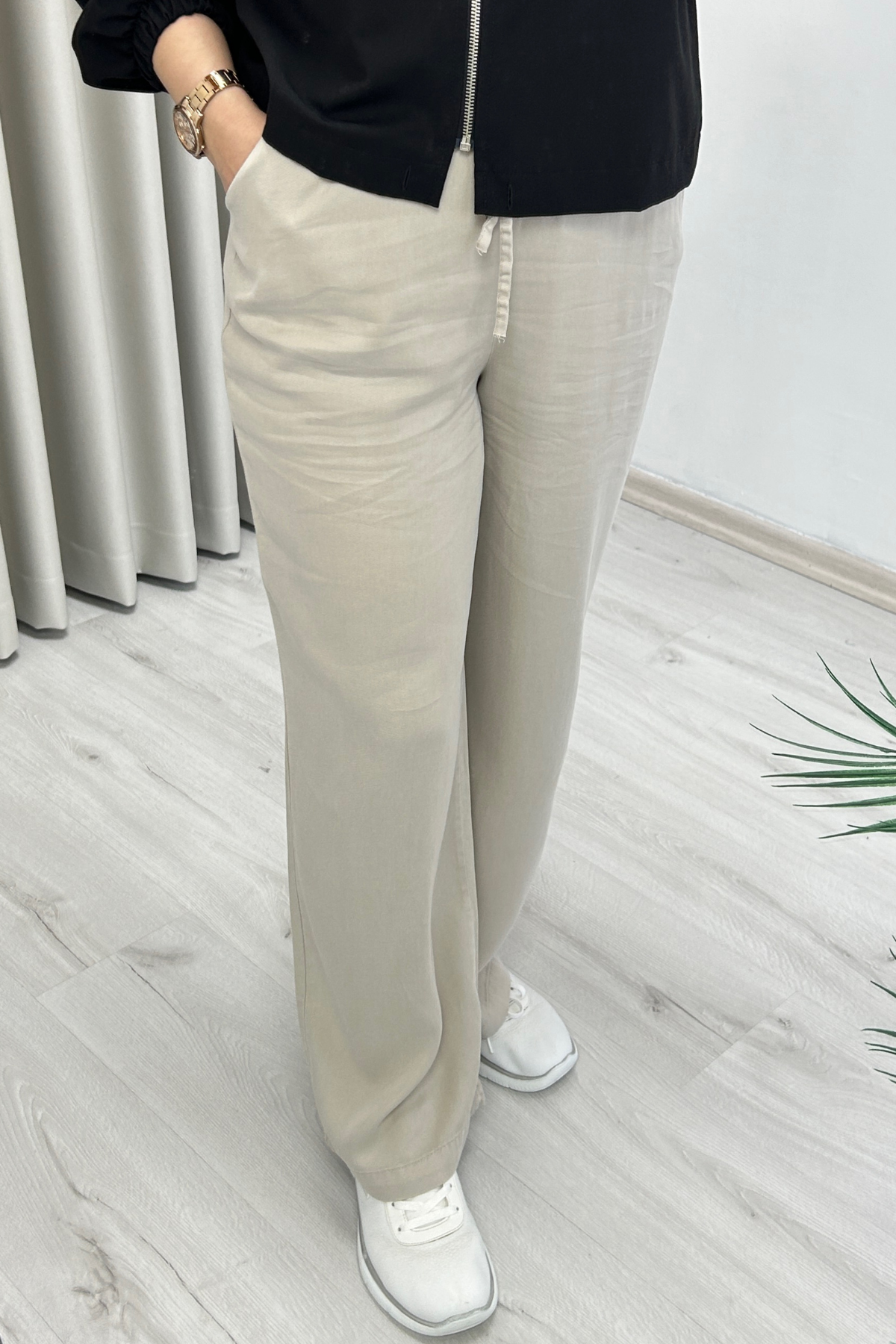 Yeni Sezon Premium Kumaş Yumuşak Dokulu Dökümlü Kadın Pantolon Bej