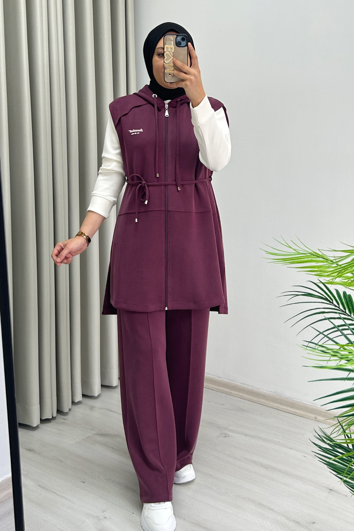 Yeni Sezon Tripen Premium Kalite Kapüşonlu Yelekli Tesettür Üçlü Takım Mürdüm